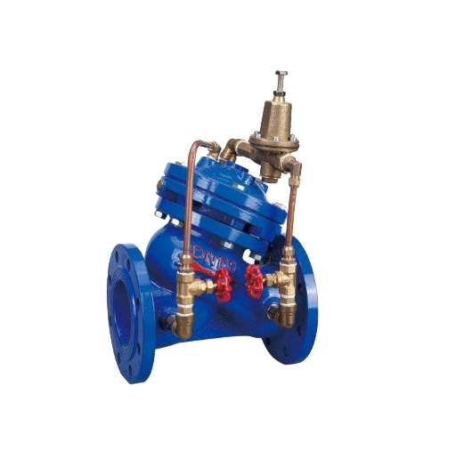 当管道从进水端给水时,水流过针阀进入主阀控制室,出口压力通过导管作用到导阀上,当出口压力高于导阀设定值时,导阀关闭,控制室停止排水,此时主阀控制室内压力升高并关闭主阀,出口压力不再升高。